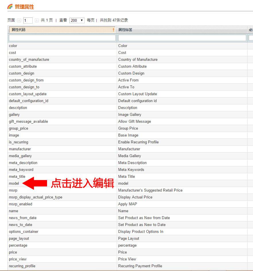 接着我们会看到商品的属性罗列出来,magento是默认一页20个显示,为了方便看到到更多属性,我们把显示数值调整为最大值,如下图: