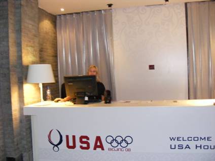 下午六点,我们乘车去“茉莉餐厅”——美国奥组委所在地。下图是我们以步入茉莉餐厅的大院,即将步入茉莉餐厅,餐厅外墙已被美国奥组委的标识装饰起来。