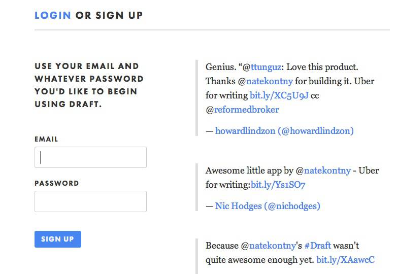 当我们讨论登录/注册页面的时候,可以轻松脑补出页面的造型——其实绝大多少的页面都差不多,本质上也就是个表单。但是有人并不打算随大流。曾经开发出著名应用Draft的Nathan Kontny,他在设计页面的时候,将用户的留言添加到表单右边,将互动与沟通的氛围呈现出来,吸引更多的潜在用户来注册。