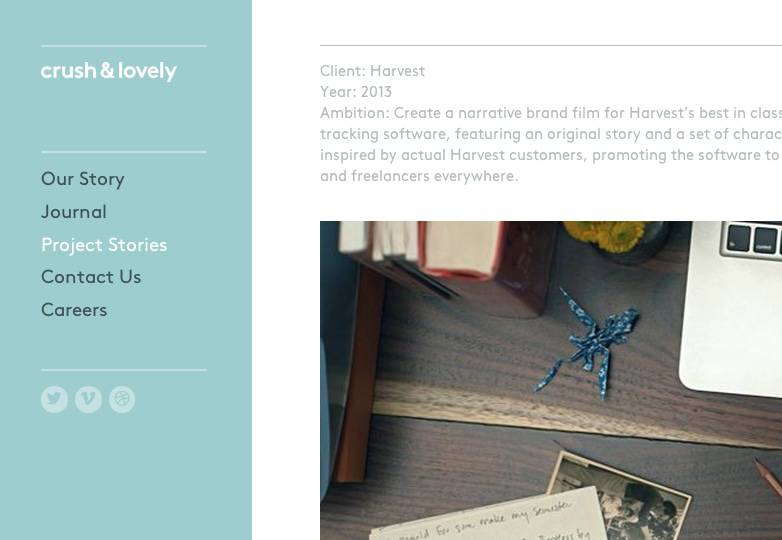 StudioCrush是一个用来展示各种项目故事的网站。网站将叙述方式简化了下来,每个项目本质上就是从开始(项目起源)到结束(项目交付)的过程,中间由关键的叙事线索(过程)桥接起来。