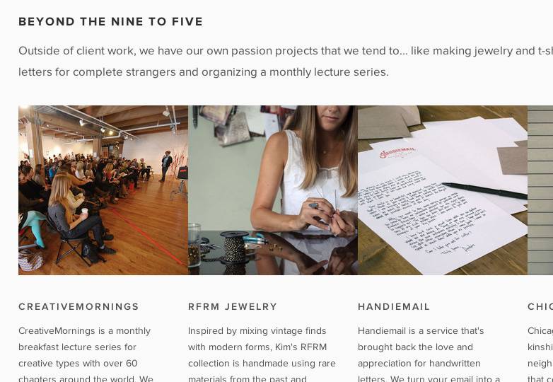 这是一个关于公司目标和员工的页面,其中写了他们的使命、愿景和目标。但是,不同于其他的类似设计,Knoed Creative通过这个“朝九晚五之外”的内容模块展示了员工工作之余的生活和经历,将这个公司多样化的一面生动地呈现了出来。