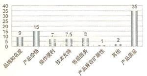 从以下图中不难看出,消费者对安防产品最重视的是质量,然后是价格因素,而品牌认知度与产品质量在消费者心目中是结合的;在消费者心目中,售后服务和技术支持比产品本身的操作性能强弱更有吸引力。