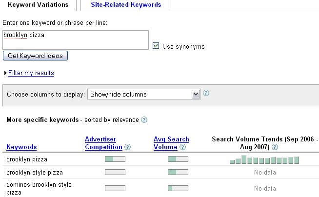 我们的查寻“布鲁克林薄饼”这个短语时得到各种各样的结果,它与SEOBook的结果相似,只是没有具体的数值。SEOBook表明“布鲁克林薄饼”Google查寻容量是每个月2,468次。