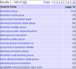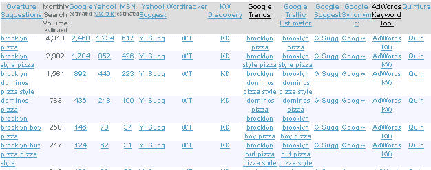 Wordtracker提供一个免费关键词工具,尽管它没有告诉您数据的来源,不过却使您能够区分关键词的优先次序。当我们查寻“布鲁克林薄饼时”,我们看到一些认为较好的关键词并没有包括在餐馆网站的链接里。这帮助我们更好的瞄准目标。我们能从中发现从最热门的33次查寻中“布鲁克林薄饼”有14次,“布鲁克林样式薄饼”有12次。