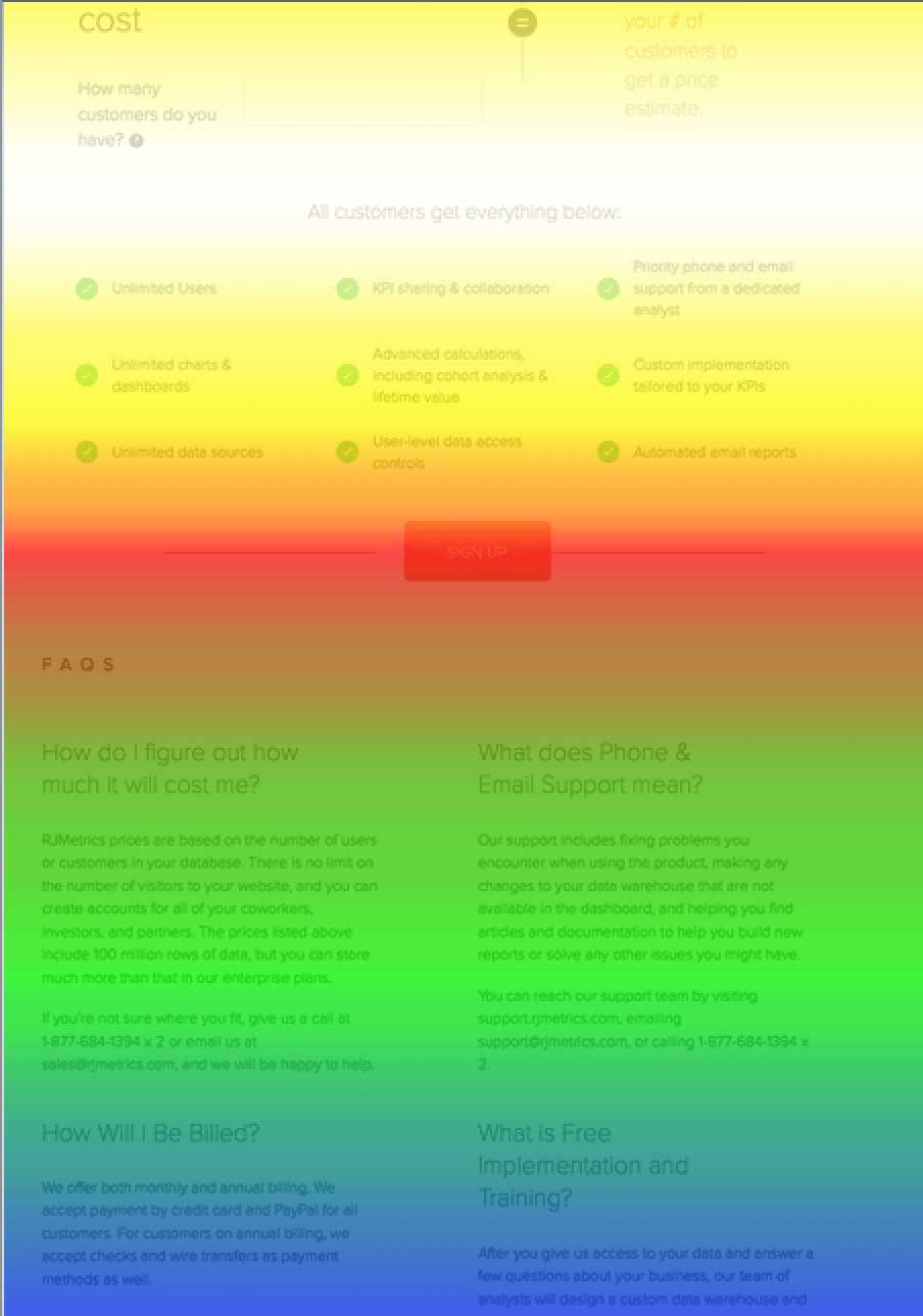 Rjmetrics的前端开发人员根据以上热力图提出了以下假设:将按钮移动到白色热地图区域将导致更高的转换率。